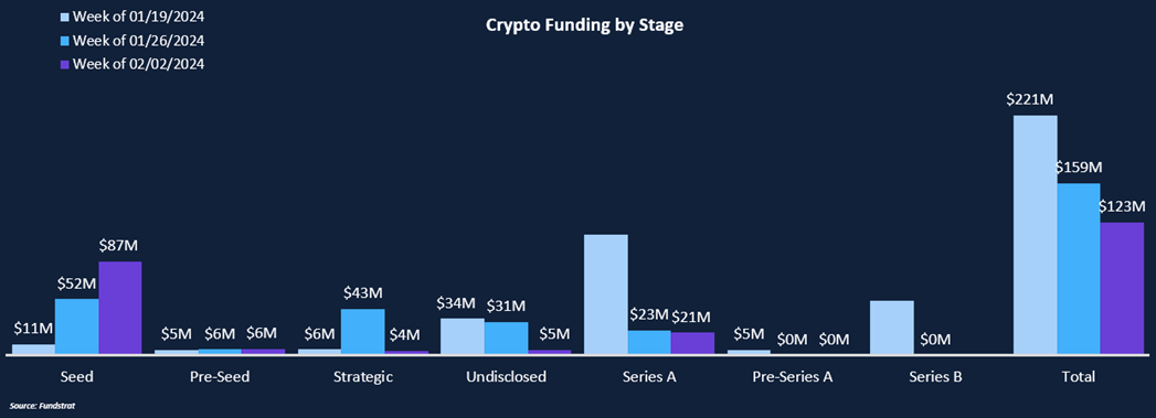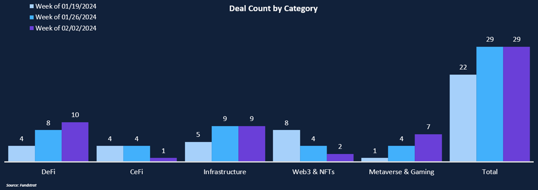Total funding fell 23% week-over-week from $159 million to $123 million, while the deal count remained constant at 29. This is the fourth week of triple-digit funding and over 20 deals, and the second in a row with nearly 30 deals, confirming private markets activity is trending higher. DeFi and Infrastructure were the leading sectors for funding, accounting for almost one-third of all deal activity each. Investors are focused on teams addressing common user pain points such as self-custody and interoperability between chains. Deals were concentrated in seed-stage companies, which received $87 million while representing 12 of the 29 deals announced. Metaverse and Gaming are seeing renewed interest, with 24% of deal activity and $25 million raised, a significant jump from the one deal and $3m raised two weeks ago. As the bull market trend solidifies for liquid token markets, investors are beginning to get comfortable betting farther out on the risk curve on speculative, unproven models, hoping to be early to the next potential trend.