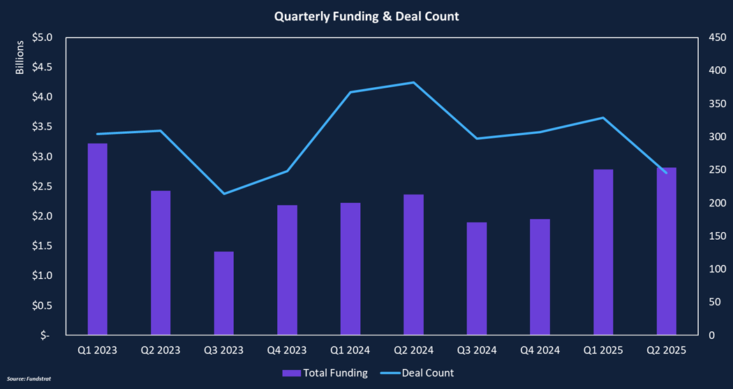 June wrapped up Q2, bringing quarterly funding totaling $2.8 billion, the highest quarterly amount since Q1 2023. Interestingly, despite Q1 and Q2 being the most funded quarters in two years, there hasn’t been a notable rise in deal counts, signaling less froth compared to the 2021 and 2022 craze. This also aligns with the increase of larger mid-to-late-stage funding rounds this year.