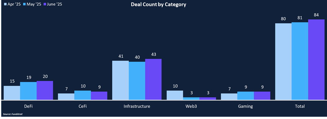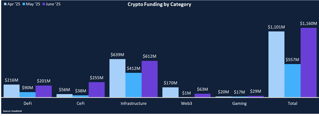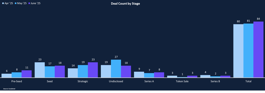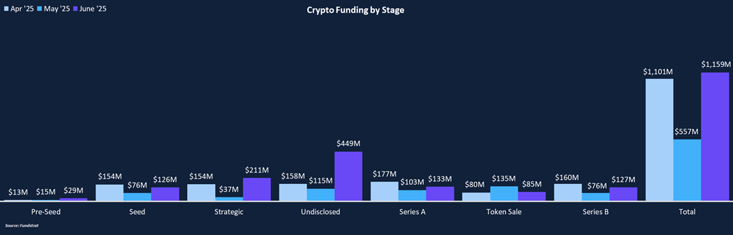 June was another good month for crypto funding, with $1.2 billion in total funding across 84 deals, representing a 108% MoM increase, while deal count was relatively flat with a 3.7% increase. June was the second month in 2025 to have over $1 billion in funding, topping April’s high of $1.1 billion. Unsurprisingly, Infrastructure was the leading category, making up 53% of funding and 51% of deal count. CeFi was the second leading category, making up 22% of funding and 11% of deal count. Gaming and Web3 remain the weakest categories, with under $100 million in total funding across 12 deals. From a deal stage perspective, Strategic rounds were the leading category in both funding and deal count, with $211 million across 23 deals. There were three Series B rounds in June, totaling $127 million. Similarly, there were three token sales in June totaling $85 million, including a $70 million OTC purchase of EIGEN from a16z.