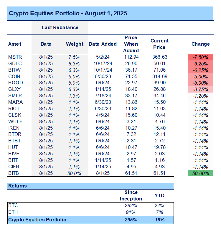 We’ve taken a similar approach in our Crypto Equities portfolio, cutting each equity position in half and reallocating 50% of the portfolio to Bitcoin via a spot ETF.
