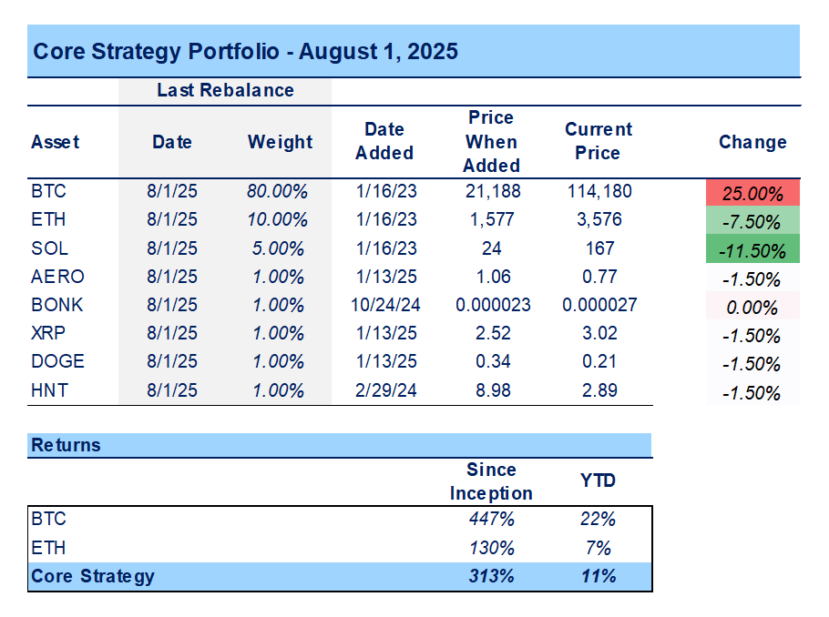 In our Core Strategy portfolio, we’ve increased our allocation to Bitcoin to 80%, while trimming ETH to 10% and SOL to 5%. All remaining altcoins in the portfolio now carry a 1% weight each.