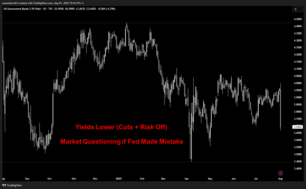 This created a clear disconnect between Powell’s posture and the hard data, injecting fresh uncertainty into the policy outlook. Risk assets rolled over, while yields dropped sharply, particularly the 2-year, which collapsed as rate cuts were priced back in and investors de-risked.