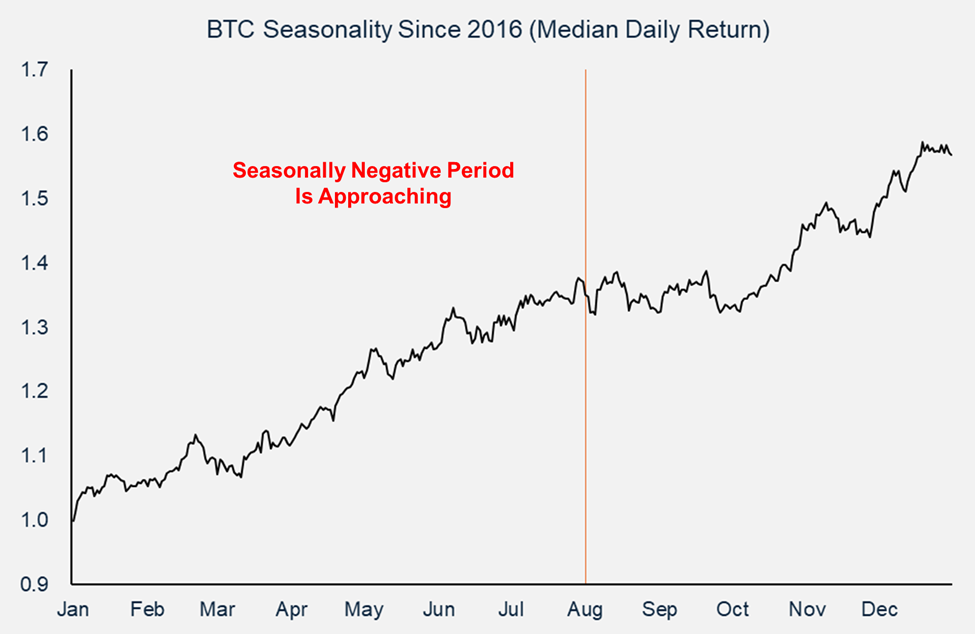 Adding to the headwinds, we are also approaching a seasonally weak period for crypto. As we’ve been highlighting, mid-August through September is historically the worst stretch of the year for the asset class.