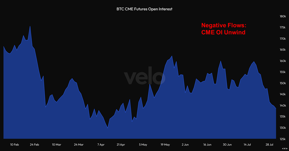 We are also seeing a negative shift in flows. CME Bitcoin futures open interest has unwound significantly over the past couple of weeks, reflecting a waning appetite for exposure from institutional players.