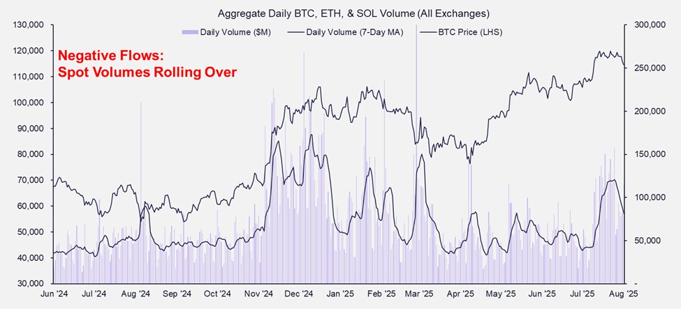 Spot volumes are also rolling over. Below, we include a chart of aggregate daily volumes across BTC, ETH, and SOL to visualize the slump.