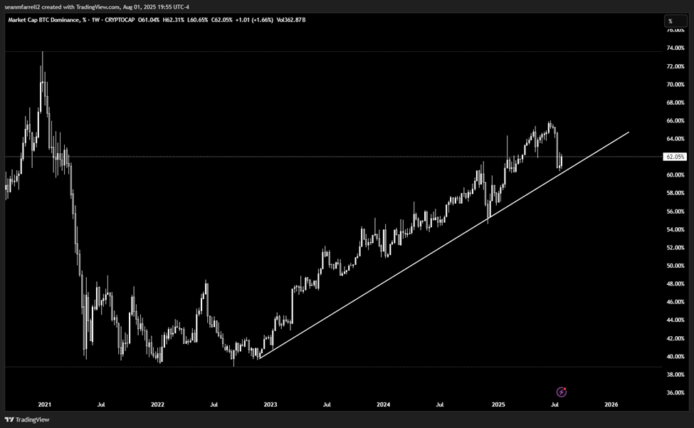 Meanwhile, Bitcoin dominance looks poised for a bounce. While that often reflects BTC outperforming on the way down, it’s worth noting that we might also see BTC lead during a rebound. The chart itself isn’t conclusively bullish or bearish, but it’s something to keep in mind as we assess the current environment.