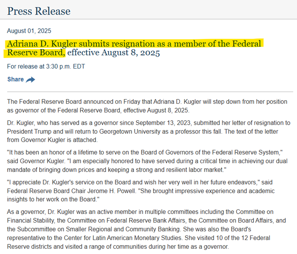 On Friday afternoon, the Fed announced that Fed Governor Adriana Kugler had submitted her resignation. Appointed by President Biden, her departure opens up a spot that would presumably be filled by a Trump-aligned appointee, likely someone who favors rate cuts and may be his preferred next Fed Chair.