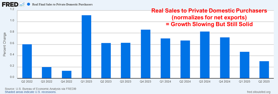 - An economy that’s slowing but still posting decent underlying growth. As evidenced by real sales to private domestic purchasers (this metric is currently preferred over GDP since it removes the volatility of net exports from the equation), growth is slowing but in fine shape.