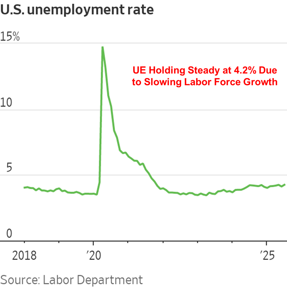 - An unemployment rate still sits at a manageable 4.2% due to slowing labor force growth, offsetting slowing jobs growth.
