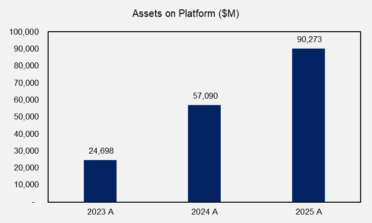 Assets on platform exceed $600bn by 2030, supported by strong crypto market growth and meaningful gains in institutional market share. Monetization rises to ~36 bps, driven by higher activity per asset and broader adoption of prime, settlement, staking, subscriptions, and stablecoin services.