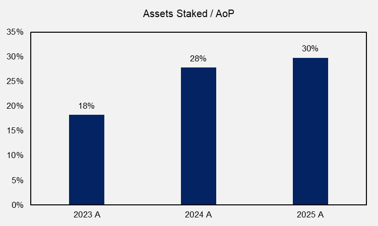 BitGo earns a portion of the rewards paid out to stakers. Its net take rate (measured as % of staked assets) on staking services in 2025 amounted to ~15 bps, down from 25 bps in 2024. This is in line with industry standards and is likely to remain around this level due to increasing competition in this vertical. However, they have been able to activate an increased percentage of their AoP over the past two years, with assets staked / AoP increasing from 18% in 2023 to 28% and 30% in 2024 and 2025, respectively. The performance of this business is closely tied to asset price performance among leading PoS networks.