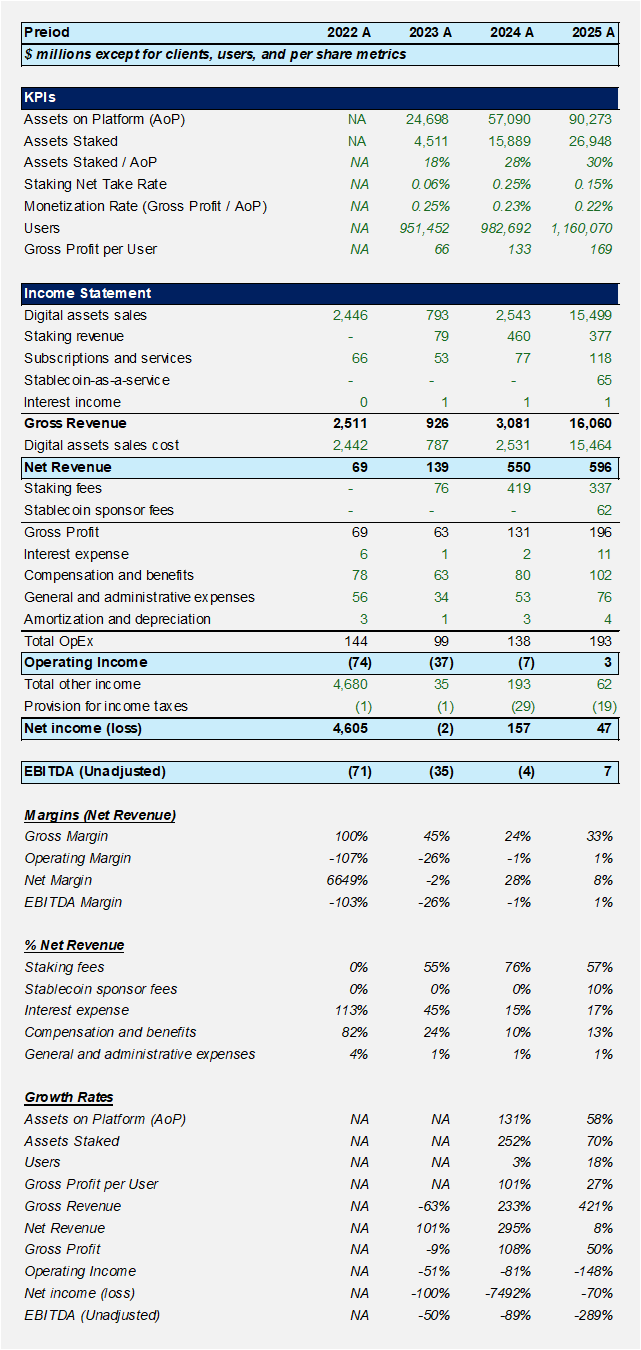 Building off the metrics discussed above, traction across BitGo’s KPIs has translated into net revenue growth of 101%, 295%, and 8% from 2023–2025. For clarity, I calculate net revenue by netting digital asset sales costs against gross revenue. Some analysts may also net staking fees and stablecoin sponsor fees, though I capture that adjustment at the gross profit level.