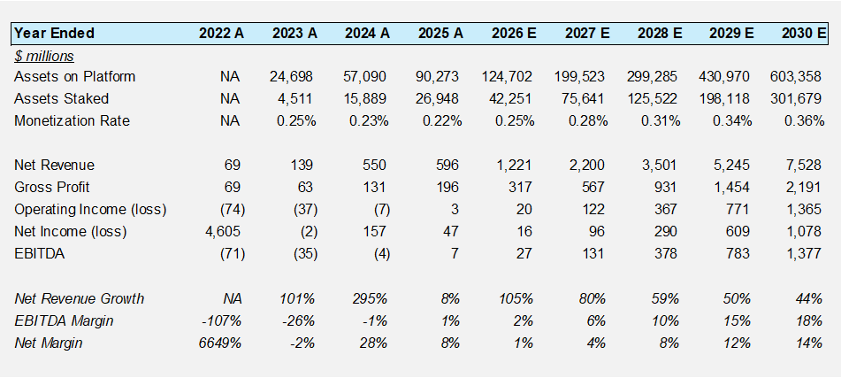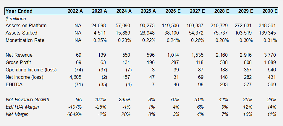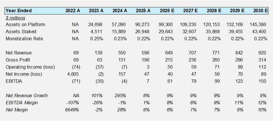 The revenue mix steadily shifts toward less cyclical, higher margin streams such as complex prime services, staking, and stablecoin-as-a-service, improving revenue quality and visibility. Net revenue reaches ~$3.8bn by 2030.