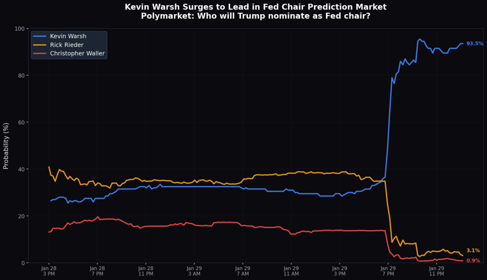 Reports late Thursday afternoon indicated that the White House was preparing to support Kevin Warsh as the nominee for the next Federal Reserve Chair. Warsh surged to over 90% probability on Polymarket around 7:00 p.m. on Thursday, overtaking Rick Rieder. On Friday morning, President Trump announced via Truth Social that he was moving forward with Warsh as his nominee.