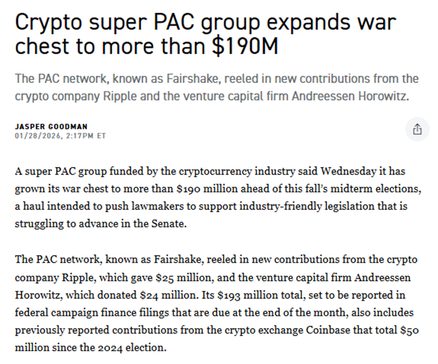 Crypto Influence on Midterms Keeps me Optimistic: On Wednesday, Fairshake, the crypto super PAC that played an outsized role in the 2024 elections announced that they raised additional capital to bring its total war chest to $193 million. Given how consequential this money is likely to be in the upcoming midterms and how central crypto was to President Trump’s platform, I remain optimistic this ultimately gets done this year, though, as discussed in our recent webinar, we may need to wait longer to see real progress.