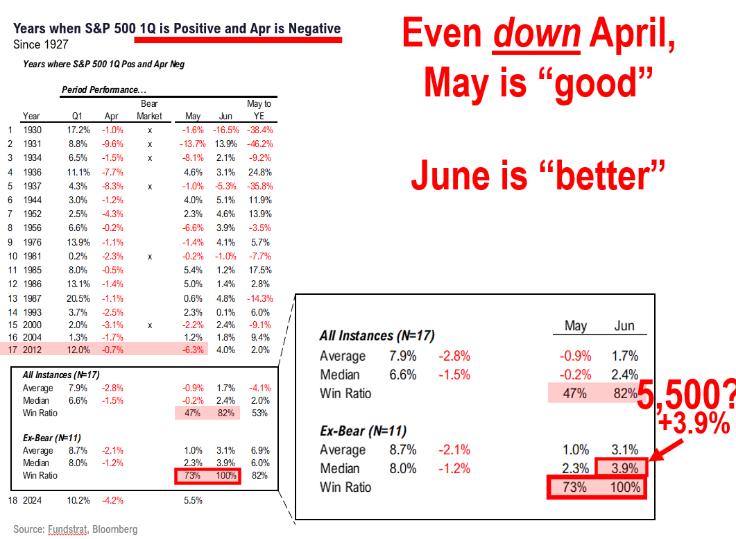 – June higher 11 of 11 times, median gain +3.9% - This implies S&P 500 could end June near 5,500, or >200 points higher. Thus, the seasonal argument alone is positive.