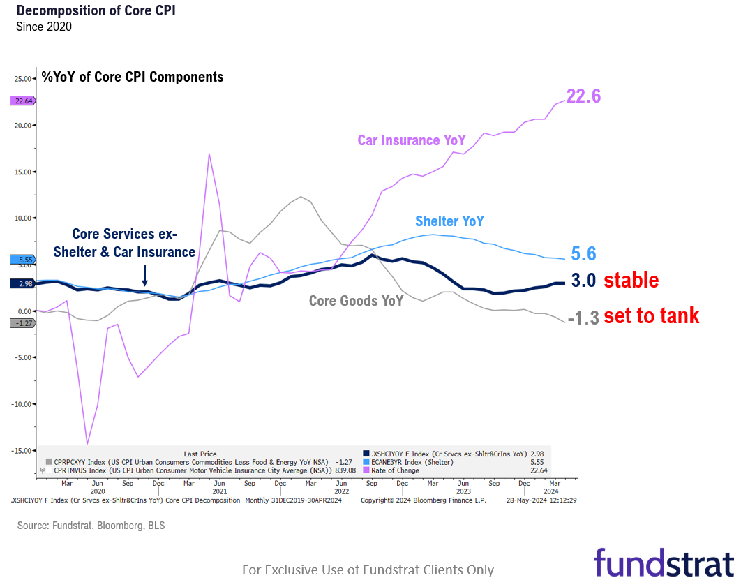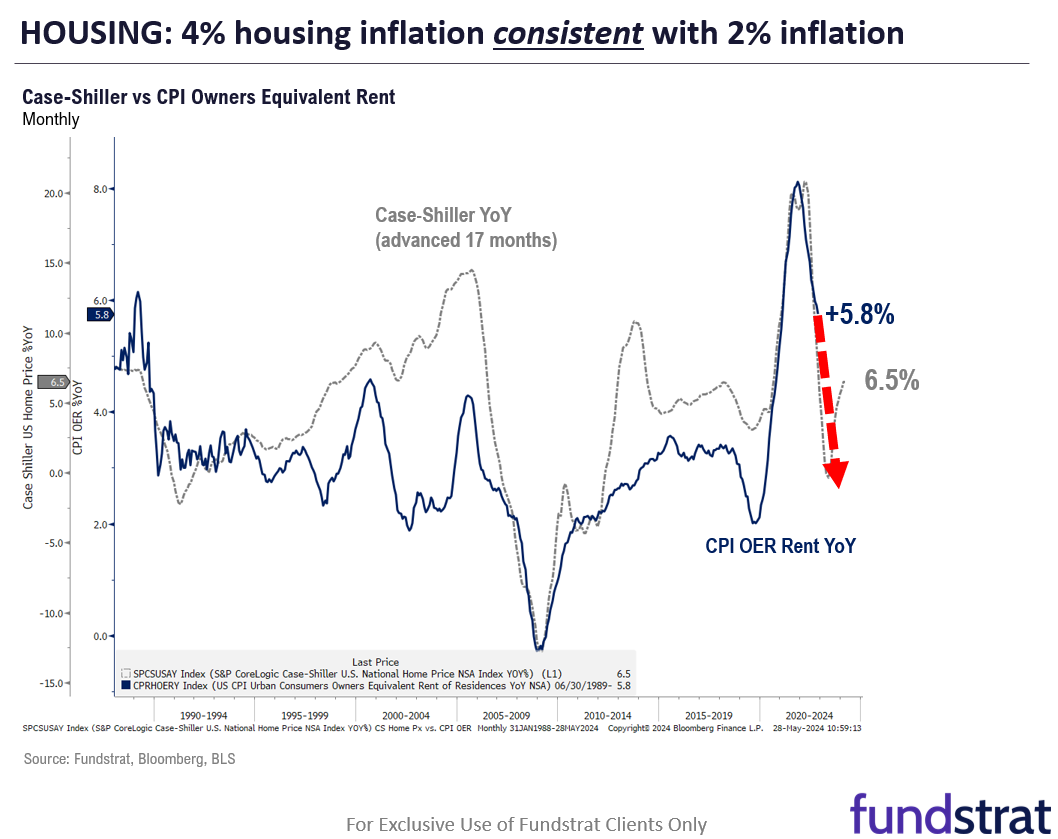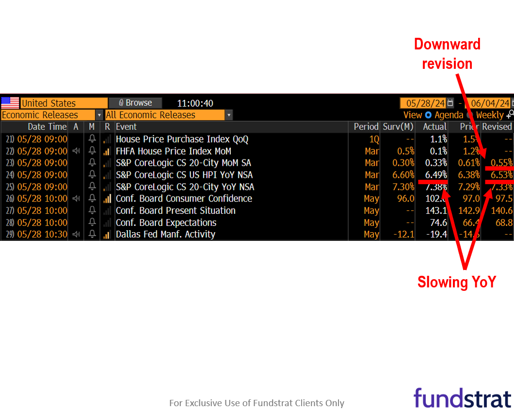 – 6/28 Fri 10am ET: Jun F U. Mich. Inflation Expectations - Today, the latest Case-Shiller home price update (March 2024) shows home prices rose +0.33% (vs consensus +0.30) but down from a downwardly revised +0.55% last month. The YoY growth rate is slowing to +6.49% (+6.60% consensus) and +6.53% last month. Case Shiller leads shelter CPI by roughly 17 months and as shown below, suggests downward pressure coming in shelter component of CPI.
