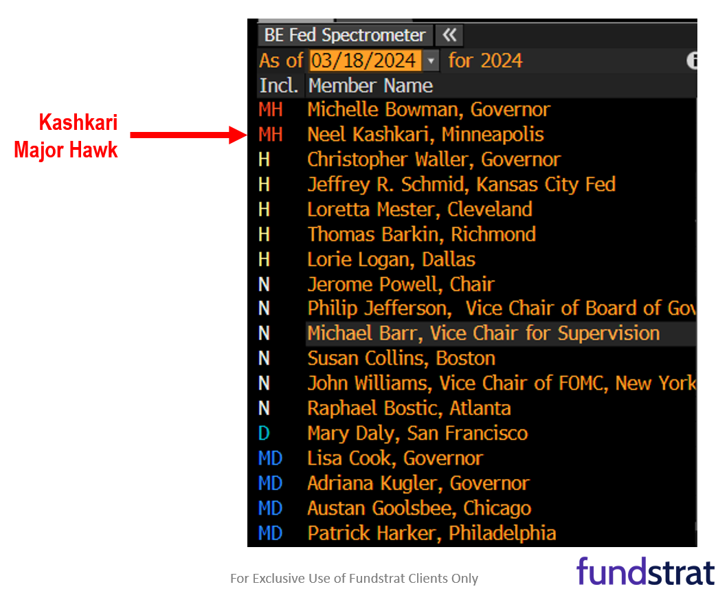 - On Fed speak this week, Kashkari came out hawkish, not surprisingly. He has not ruled out rate hikes, but he is one of two major hawks. And we expect the incoming data to be supportive of falling inflation below consensus.