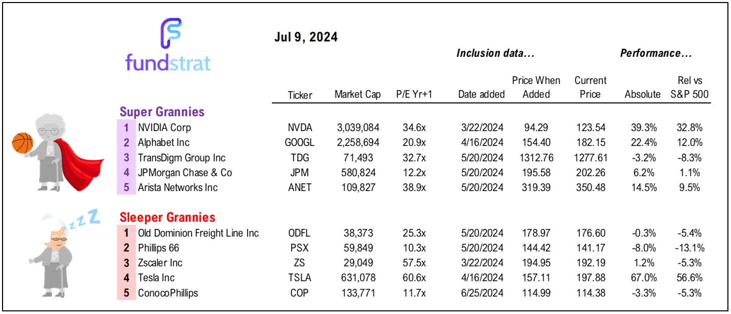 History also shows stocks strong in first half, outperform in the second half. Thus, we favor those S&P 500 names which gained >30% in 1H24. These are shown below.