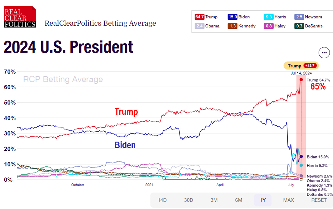The major event over the weekend is the failed assassination attempt against former President Trump. This is a huge blessing that the assassin did not succeed. Data from betting markets, including RealClearPolitics.com show Trump’s chances of winning the White House surge to 65%, the highest level since the start of this election cycle.