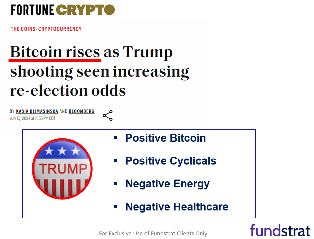 - Past research from our data science team, led by “tireless Ken” shows that forward equity returns are not that differentiated based upon which party wins the White House in 2024. But there are likely sectoral implications. Thus, if the odds of Trump winning rise, we expect the following: