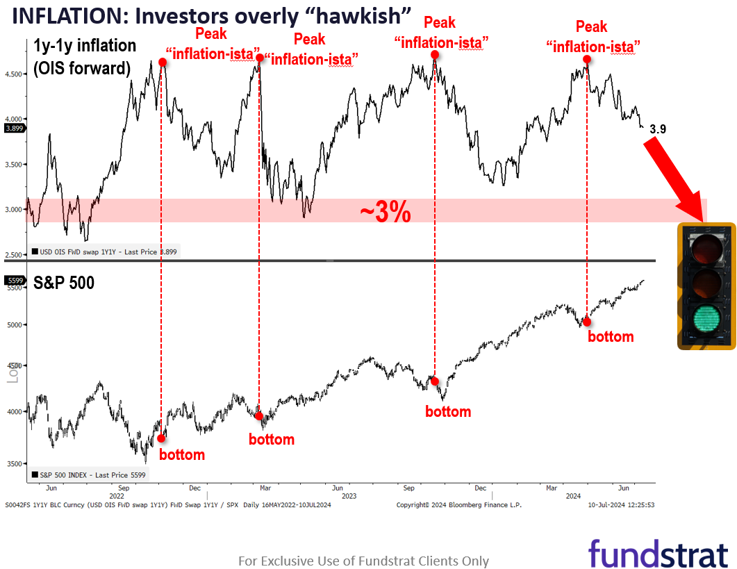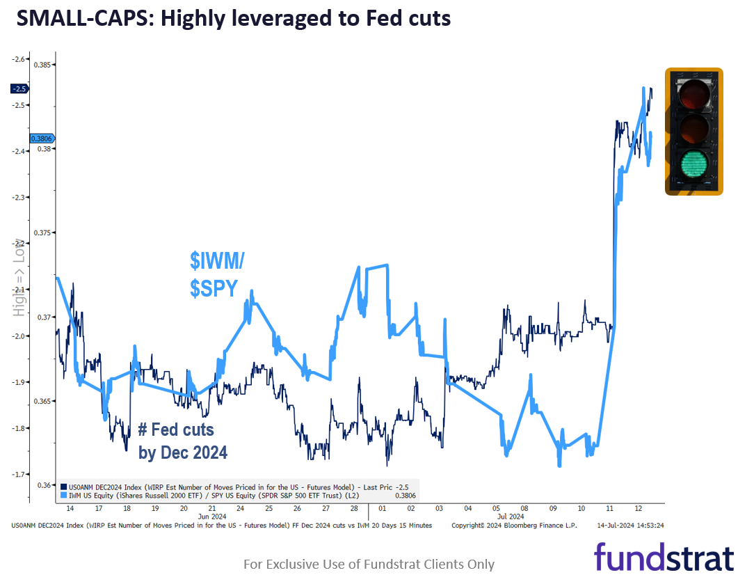 – fifth, quality spread (CCC less BB) shows a IWM catch-up trade - The fact that Sept odds jumped to 95% from 70% this past week is important. While many might view 70% as high enough to be discounted, investors are naturally wary given the volatile reactions to inflation reports. But the June CPI is now the 3rd consecutive good inflation report and enough to convince rate markets to move to 95%. As the chart below highlights, small-caps are particularly sensitive to rate cut expectations.