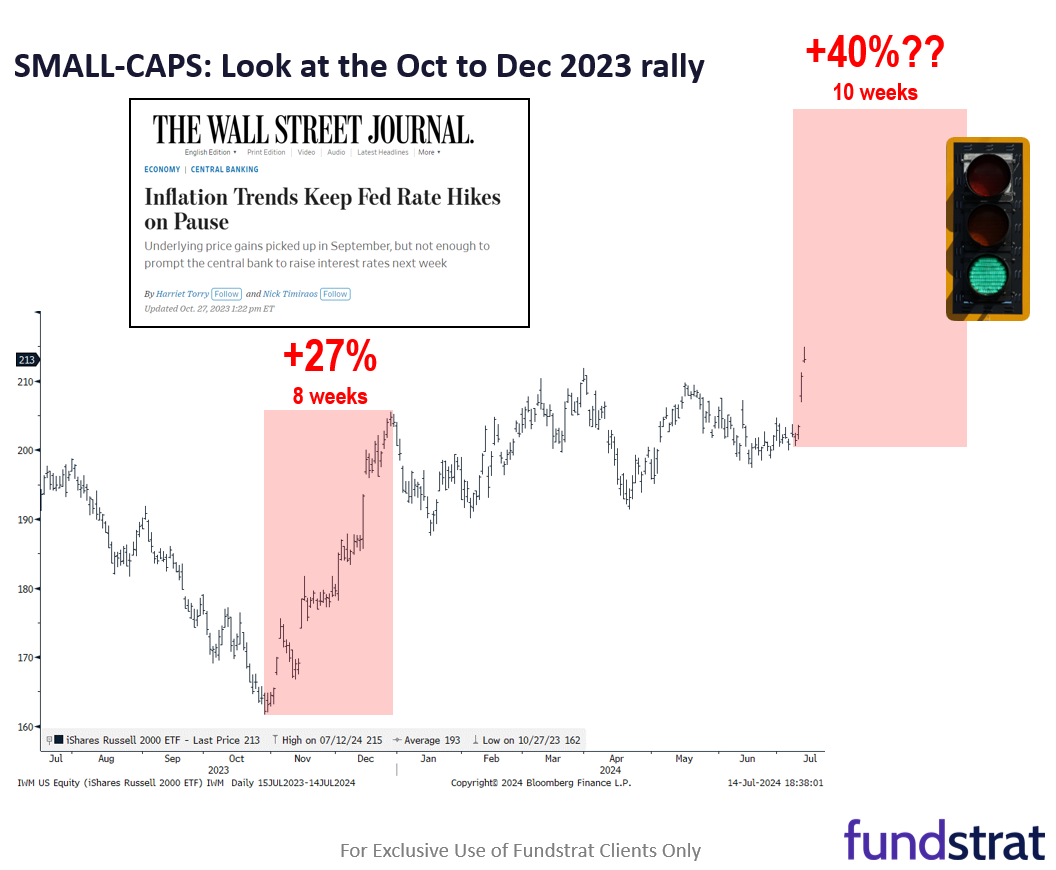 – negative for Healthcare - To me, the most compelling near-term investment case is small-cap stocks (IWM). We believe small-caps can gain as much as +50% in 2024, and so far up only 6%. Let me explain.