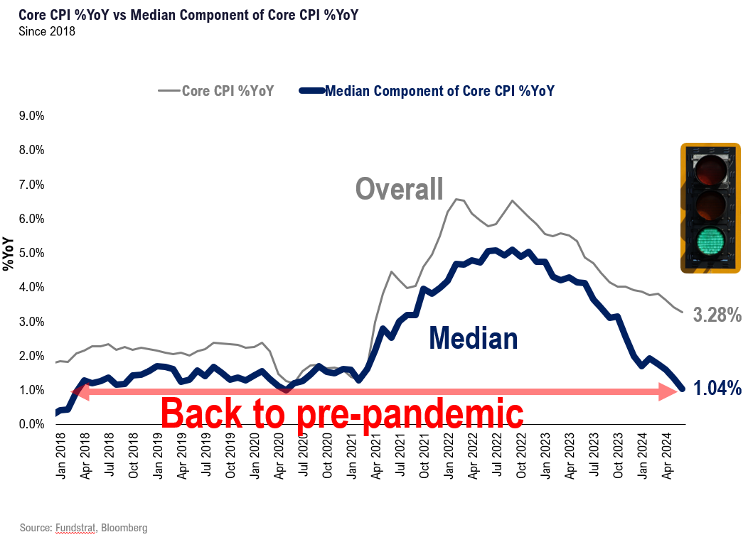 - This time, inflation is falling like a rock and the median inflation rate of +1.0% is below the pre-pandemic average. So it is absolutely tanking. Thus, any move in small-caps, we expect, would be far larger and far longer.