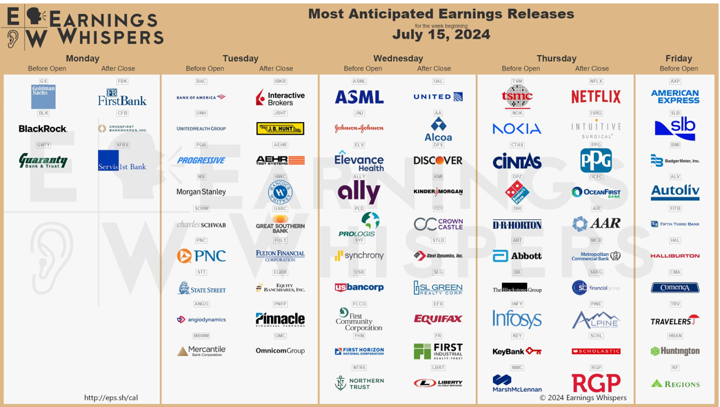 – 7/18 Thu 4:00 PM ET: May Net TIC Flows - We are also in 2Q24 earnings season, so these earnings will impact markets as well. As we noted last week, we think the overall tone should be positive, as the breadth of positive earnings should increase this quarter.