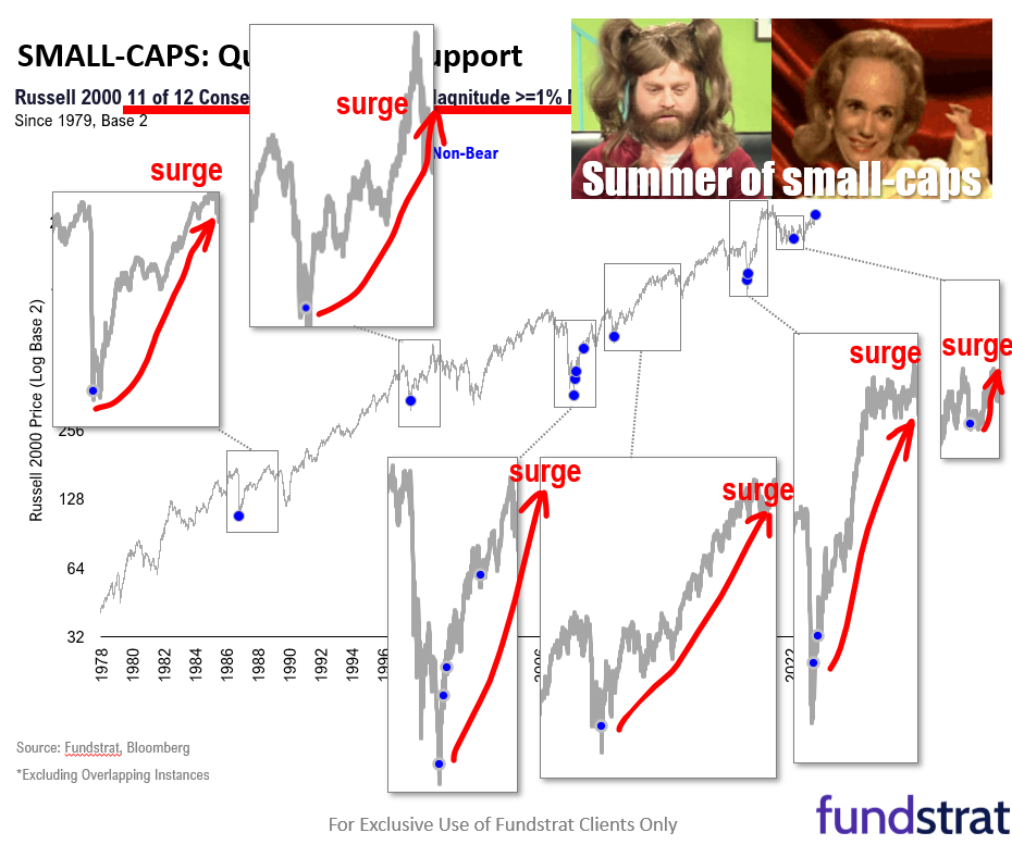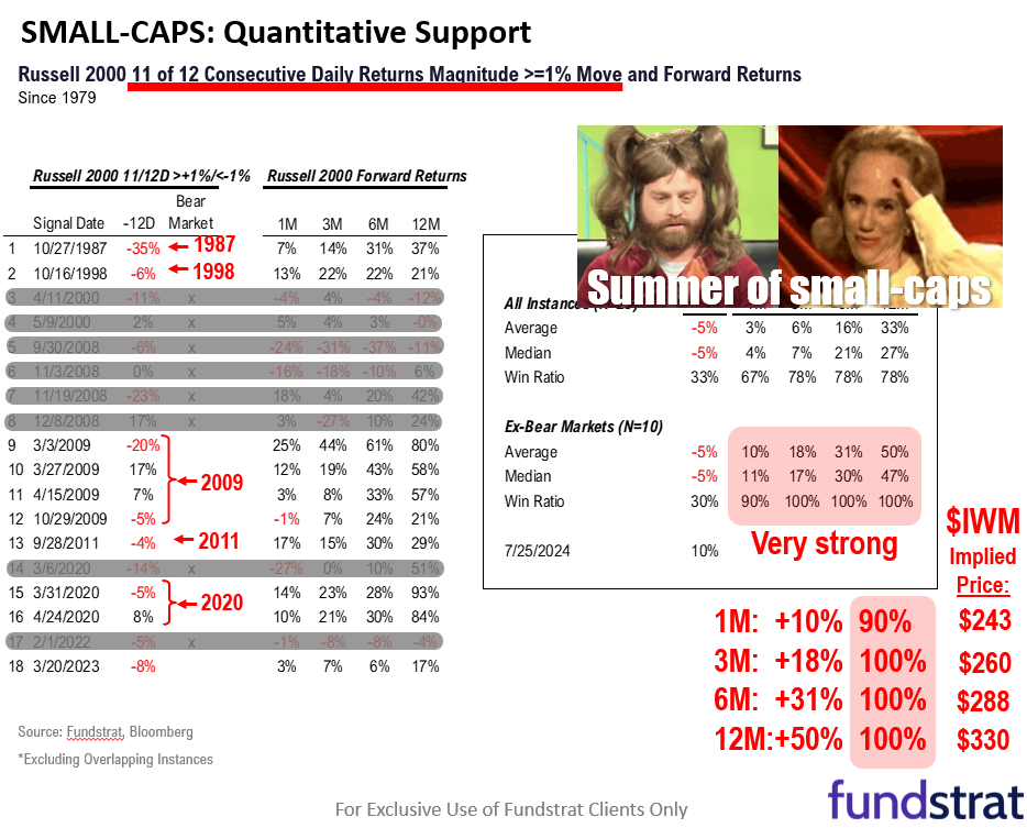 Since July 11th (June CPI), our stance is that June inflation gave the “green light” for small-caps to advance. In our view, this was a durable signal, even as many suggest this is only a “short squeeze.” Today, the Russell 2000 (IWM -2.98% ) just generated a signal only seen 10 times since 1979 and every single instance was an “early cycle” signal. In other words, today’s trading amplifies our view this is the “Summer of small-caps” and urges investors to gain exposure to small-caps.