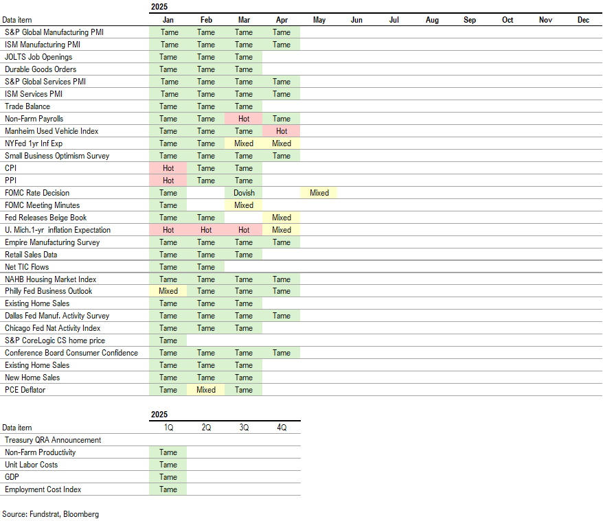 5/1 9:45 AM ET: Apr F S&P Global Manufacturing PMITame5/1 10:00 AM ET: Apr ISM Manufacturing PMITame5/2 8:30 AM ET: Apr Non-Farm PayrollsTame5/2 10:00 AM ET: Mar F Durable Goods Orders MoMTame5/5 9:45 AM ET: Apr F S&P Global Services PMITame5/5 10:00 AM ET: Apr ISM Services PMITame5/6 8:30 AM ET: Mar Trade BalanceTame5/7 9:00 AM ET: Apr F Manheim Used Vehicle IndexHot5/7 2:00 PM ET: May FOMC DecisionMixed5/8 8:30 AM ET: 1Q P Unit Labor CostsTame5/8 8:30 AM ET: 1Q P Non-Farm Productivity QoQTame5/8 11:00 AM ET: Apr NY Fed 1yr Inf ExpMixed5/13 6:00 AM ET: Apr Small Business Optimism SurveyTame5/13 8:30 AM ET: Apr Core CPI MoMTame- 5/15 8:30 AM ET: May Philly Fed Business Outlook