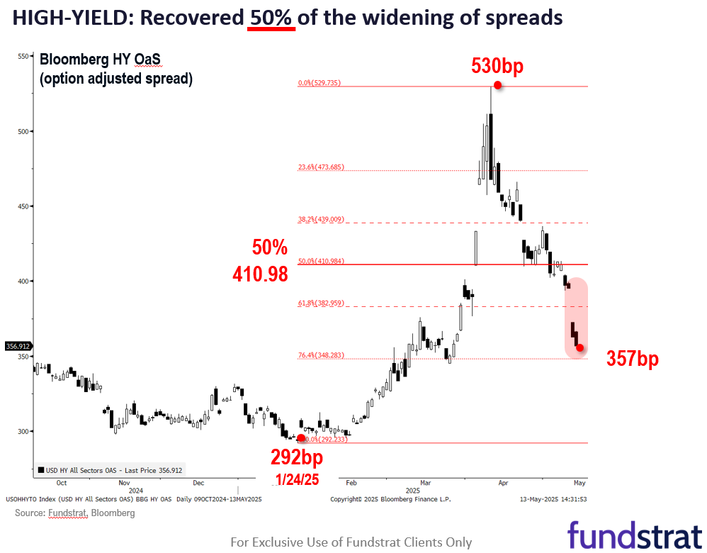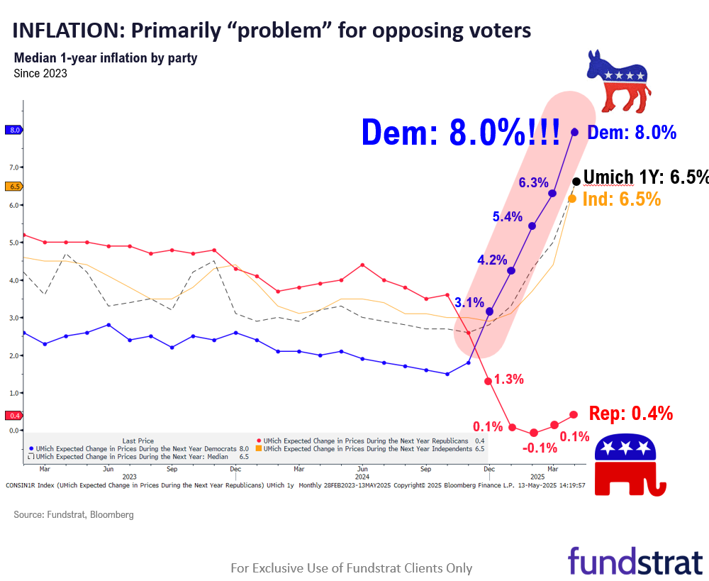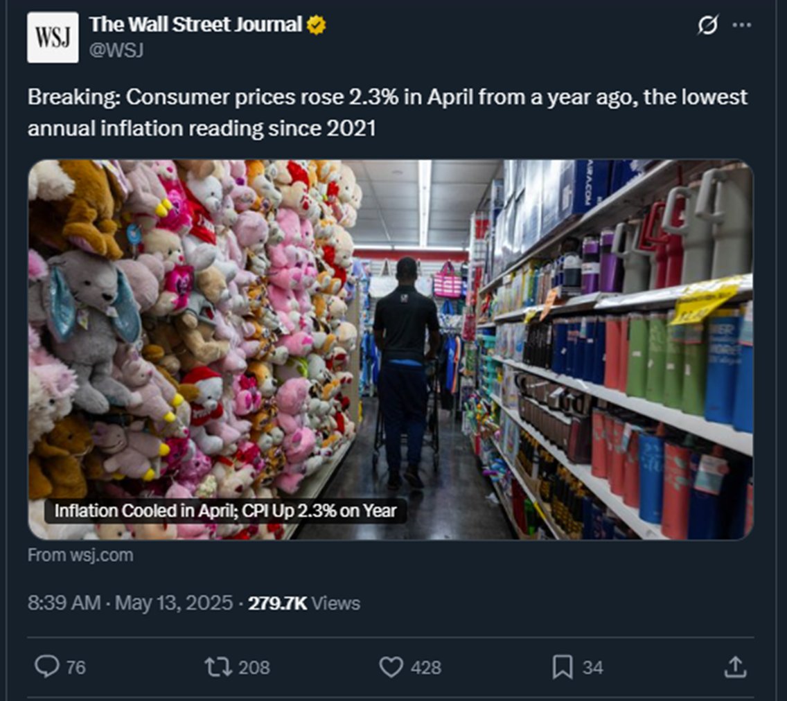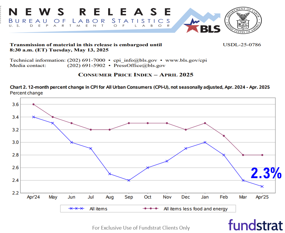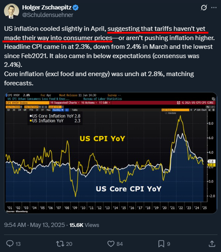 - The April CPI report (Tuesday) was also encouraging as it shows inflation is currently tracking lower than consensus expected. And this means, that tariff-distorting inflation is coming at a time of lower inflation.
