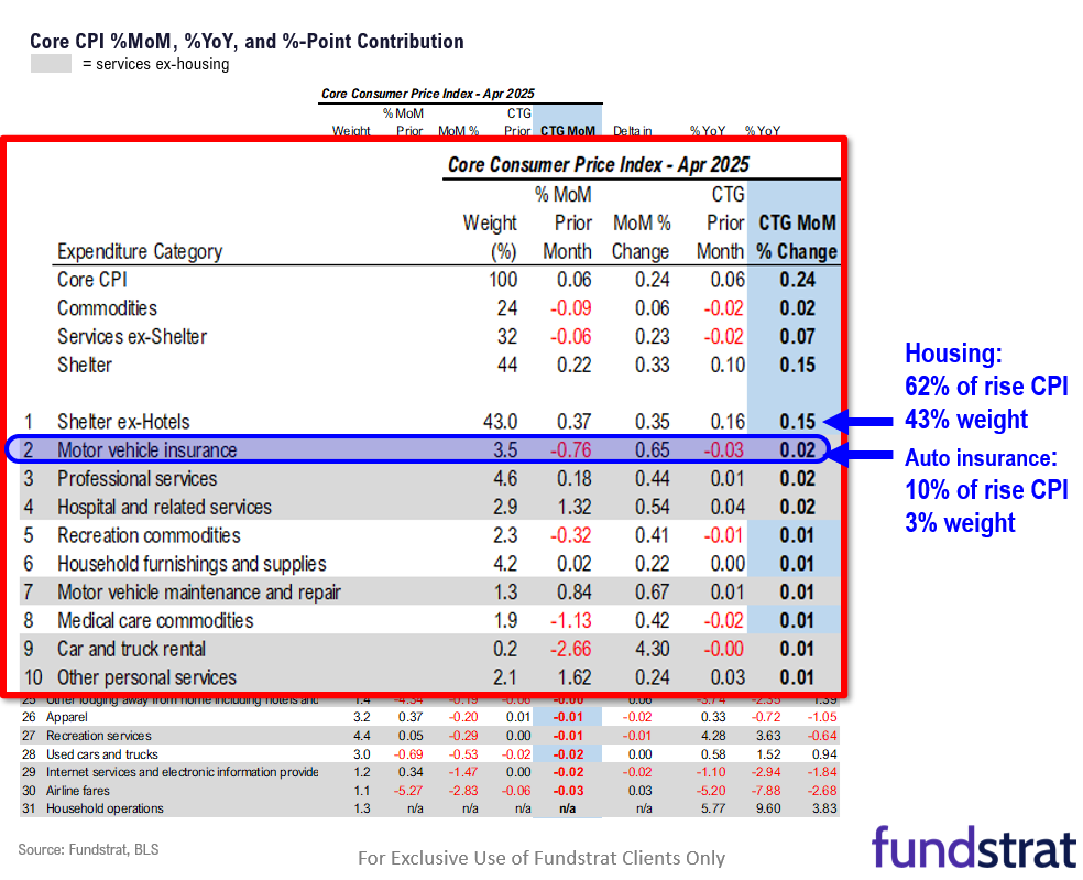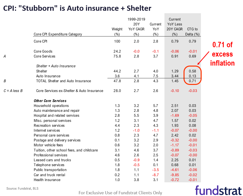 - Core CPI came in at +0.24% MoM vs consensus of +0.27% and the details were good. Shelter and auto insurance remain the two largest contributors of inflation, punching above their weight: