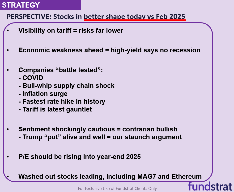– Trump “put” alive and well = our staunch argument - Put this together, and we would argue P/E should be rising into year-end 2025. Yes, the P/E of the market should be higher and expanding as risk premium should be falling.
