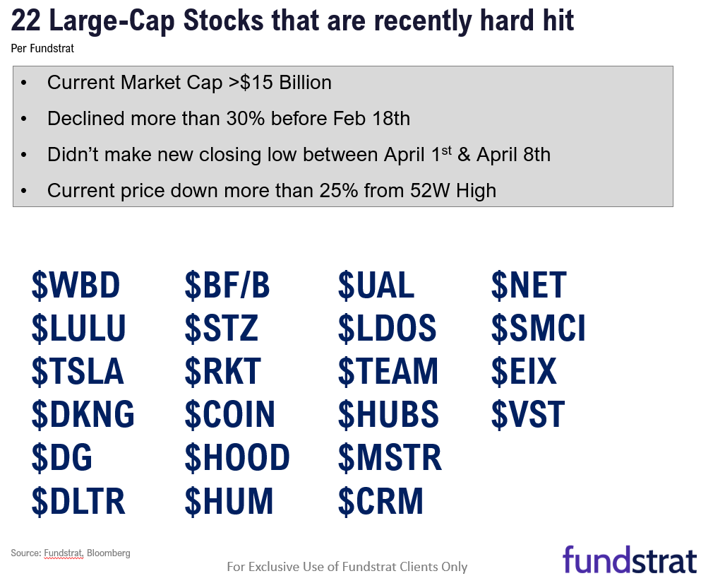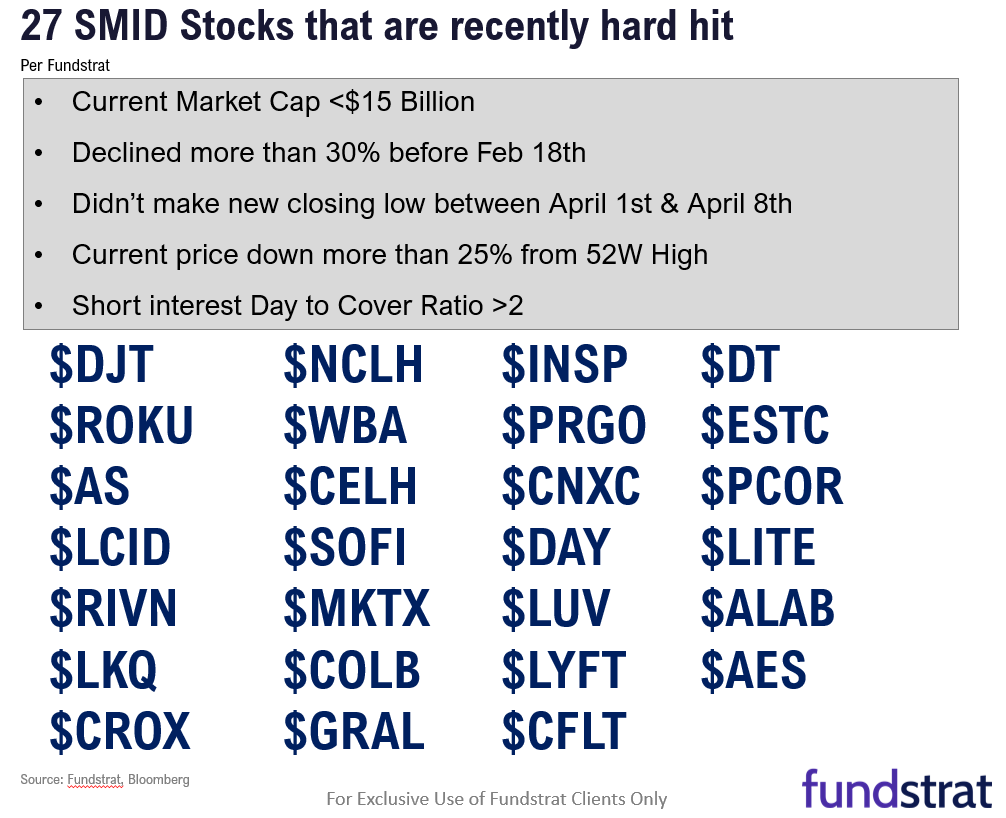 The bull market has proven itself intact. We have identified two lists of “wash out” stocks, both large-cap (22 names) and SMID-cap (27 names). We want to look at stocks which did not make a new low between April 1-April 8, even as the S&P 500 fell to new lows.