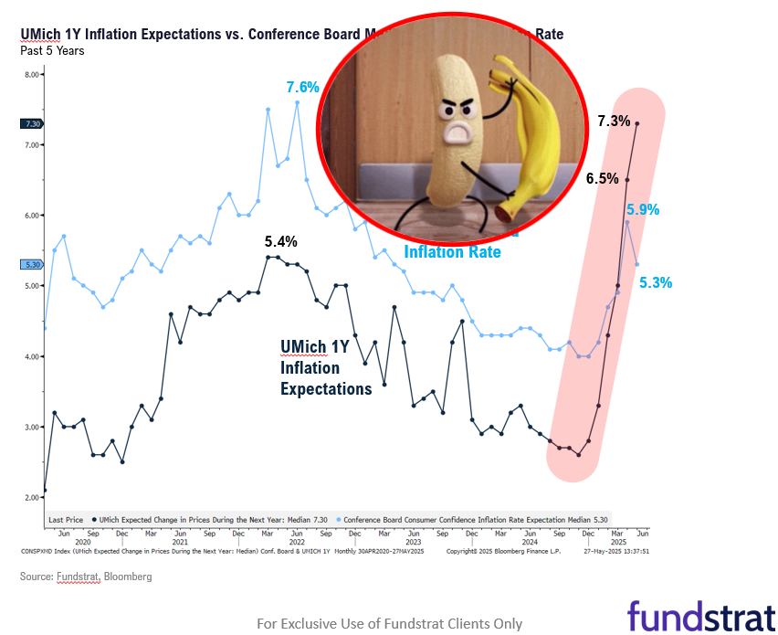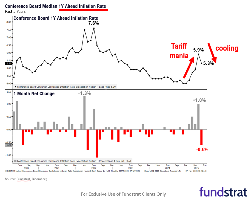 – 5/30 Fri 10:00 AM ET: May F U. Mich. 1yr Inf Exp - The Conference Board today showed a sizable drop in forward inflation expectations from 5.9% to 5.3% and the first drop 5 months. To us, this is a reflection of the perception gap: