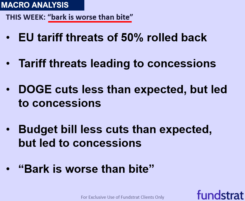 - Late last week, equities fell after President Trump tweeted that he recommends 50% tariffs on Europe. This was the type of headline that skeptics have been expecting, and stocks fell sharply. But over the weekend, the EU and White House agreed to delay the implementation to July 9th. And Tuesday, equities were rallying sharply.