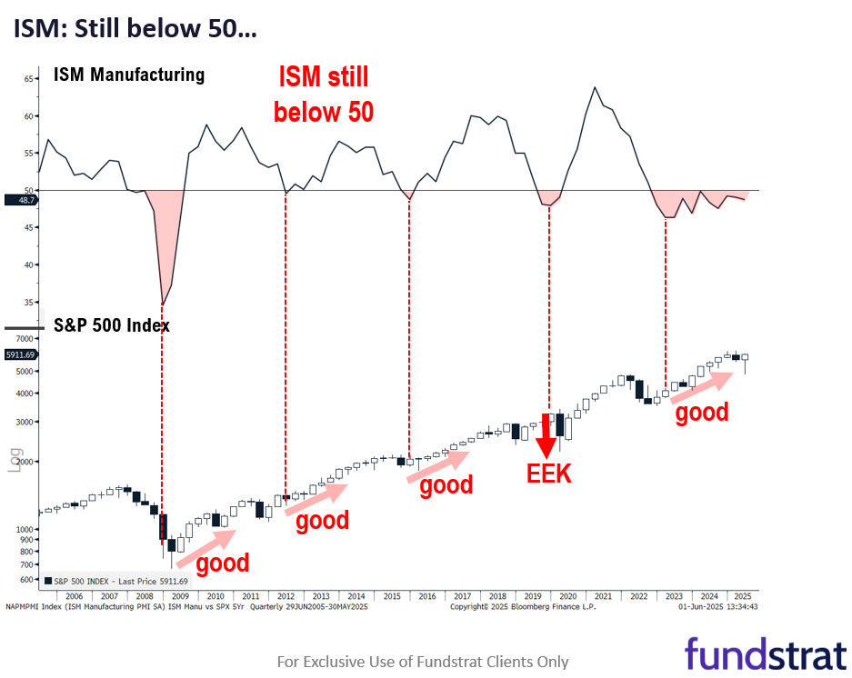 • On ISM, in the past 20 years, no bull market topped with ISM still below 50, which is where it is today. In fact, when ISM is below 50, these are periods of mid-cycle for stocks (see below).