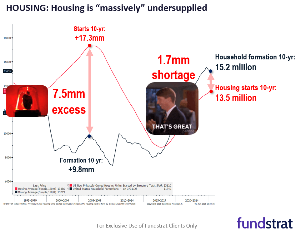• Over the past 10 years there is a shortage of 1.7mm homes cumulatively as 13.5mm starts vs 15.2mm household formations. We expect a stock market cycle peak closer to a housing cycle peak.