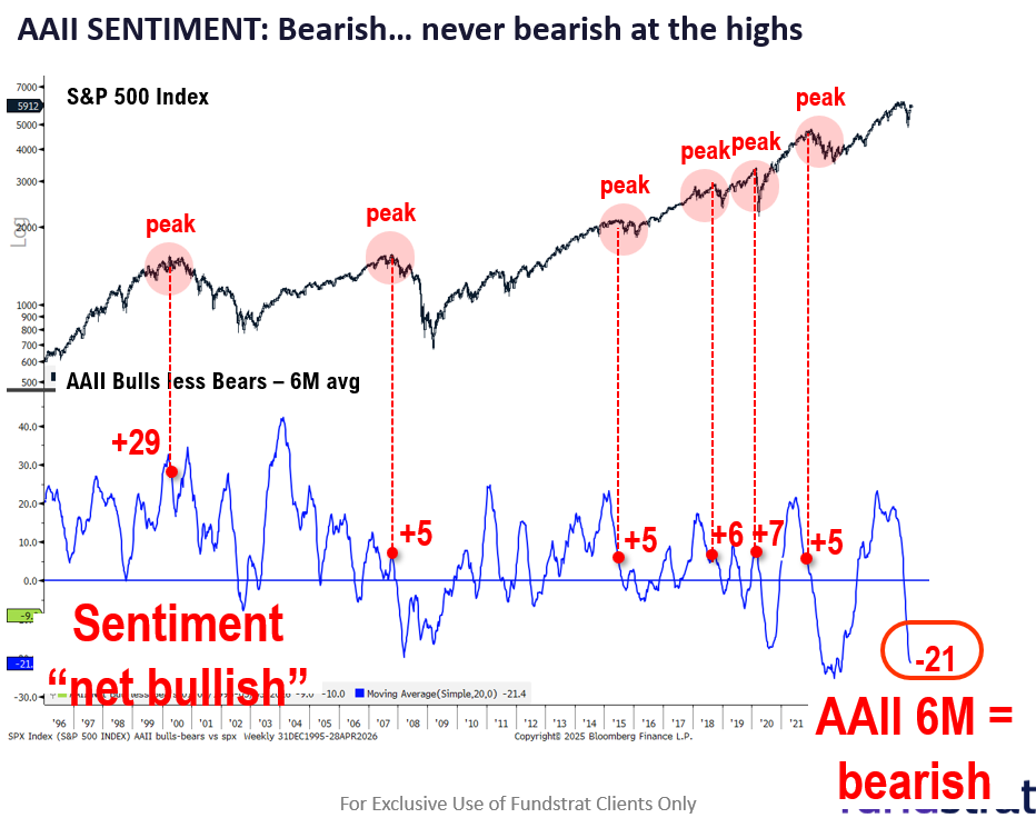 • AAII sentiment is still -21 6m avg. Since 1995, each of the major stock market tops (see below) coincided with this average >0 ranging from +5 to +29 (6M rolling avg).