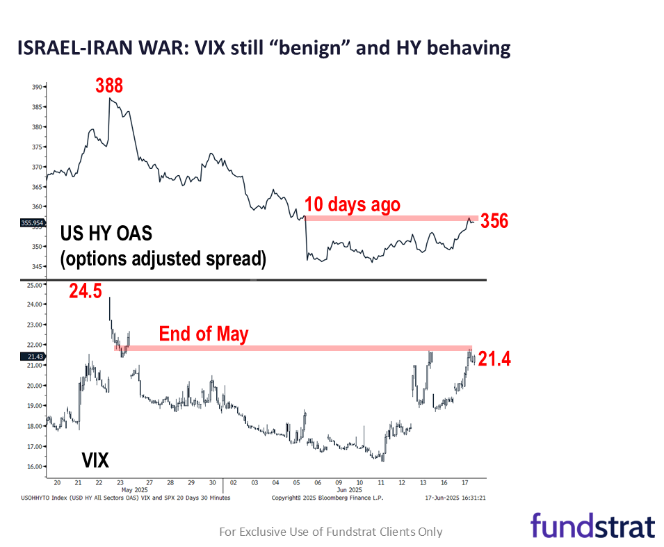- Spot VIX closed at 22, which is elevated (above 20) but as shown below, is at levels seen in late May. And late-May was hardly a time to be de-risking. Similarly, US HY OAS (option adjusted spread) is at 355. And this level, while up from two days ago, is at levels seen just 10 days ago. So the message from these markets is that a broader de-risking is not warranted.