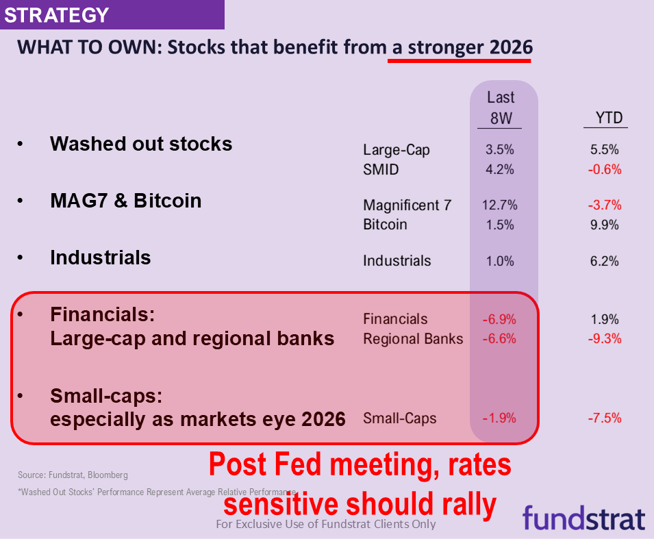 VIDEO: While Fed is not expected to cut Wed, we expect markets to rally given our view Fed has to acknowledge inflation is falling short of their views. This should help rate sensitives like Financials XLF 0.34% KRE 0.67% and small-caps IWM 1.07% .