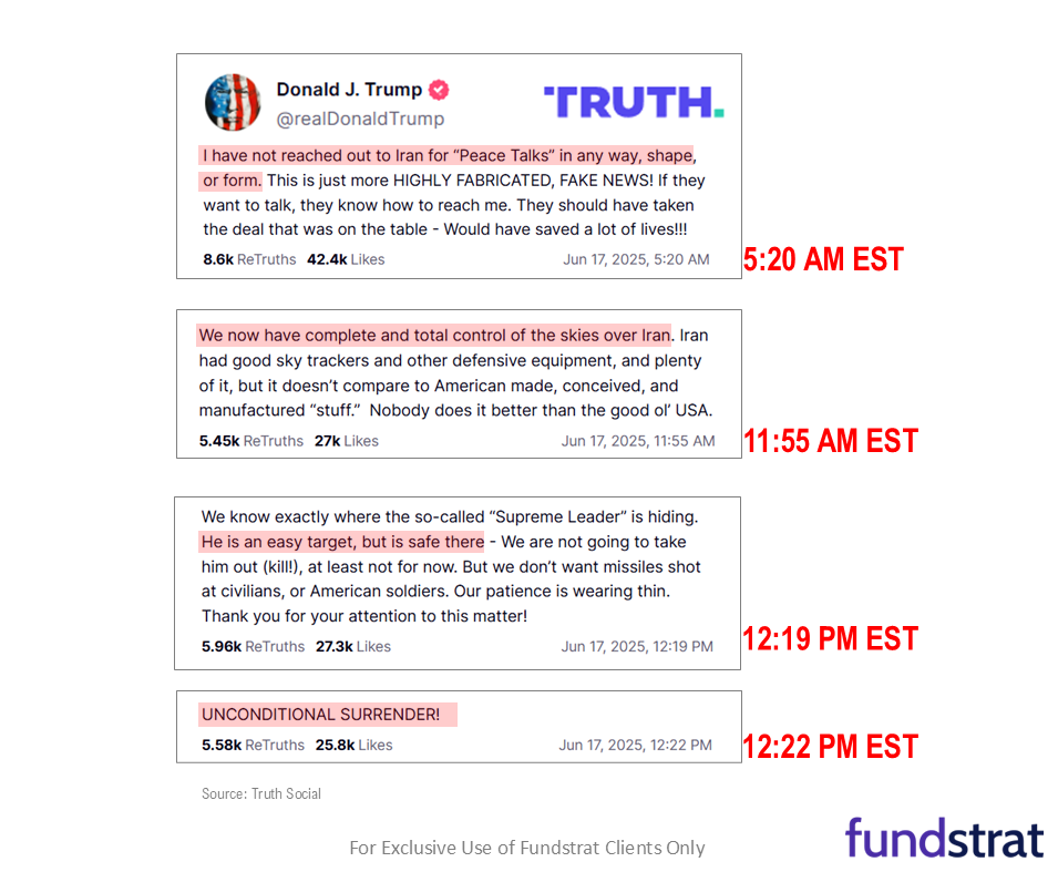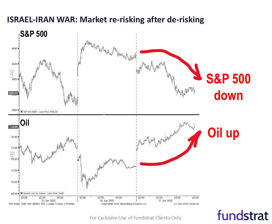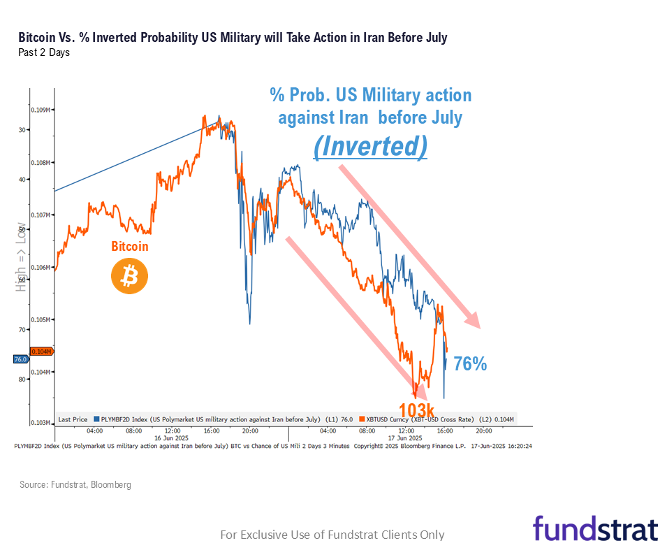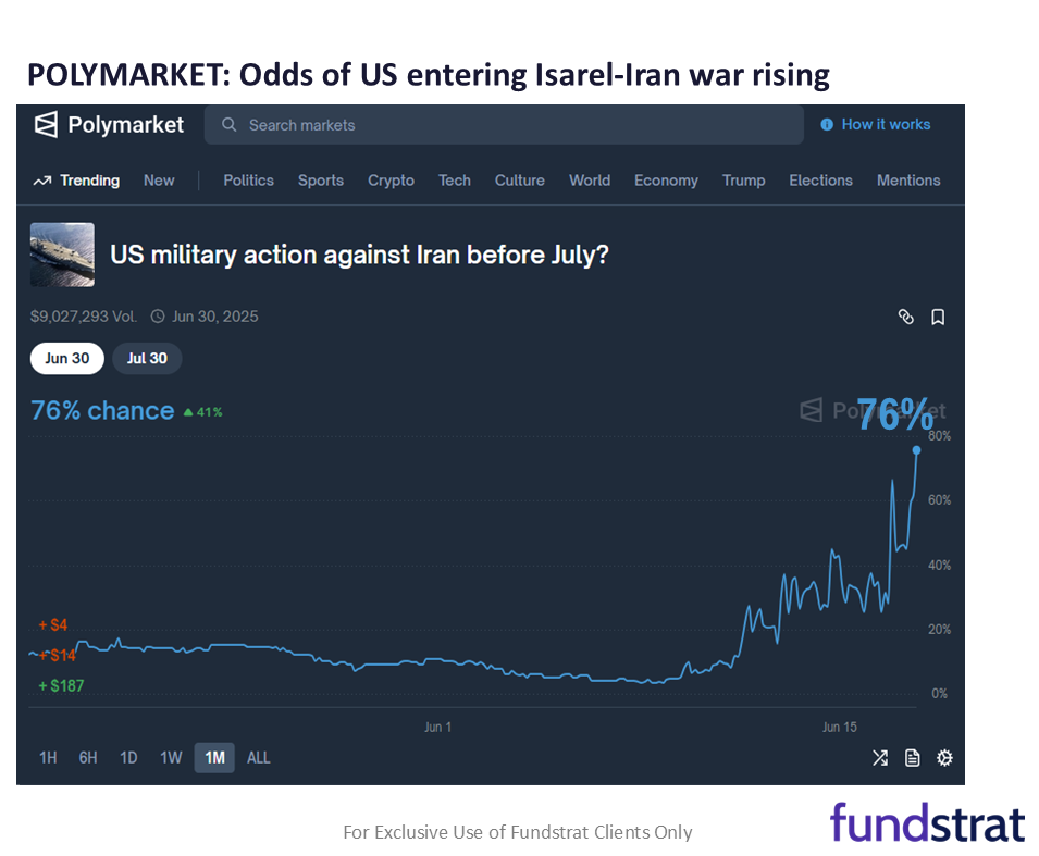 - Today, markets became wary of the risk the US would directly involve itself in the Israel-Iran conflict. The White House used terms like “we” and polymarket.com shows betting odds of US involvement jumped to 76%.