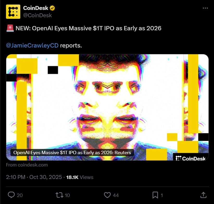 – and QT (quantitative tightening) is ending Dec 1. - Media outlets reported OpenAI plans an IPO in 2027, valuing the company at $1 trillion. This is a staggering value for a company which was essentially founded 7 years ago. But this is also testament to the supercycle ahead driven by AI.