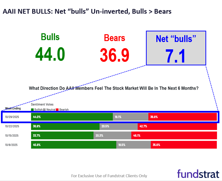 6. Sentiment remains muted = fuel for YE rally - We are halfway through 3Q25 earnings season with 244 companies reporting. 83% of companies are beating and overall beats are +4.3%, which implies overall 12% EPS growth YoY. There are many sectors posting double digit growth, so this is not only an AI story but rather demonstrates US corporates and multinationals are able to generate strong earnings gains despite the largest tariff increases in US history. Recall many economists predicted US profit margins would collapse by 3Q25 due to tariff cost surges.
