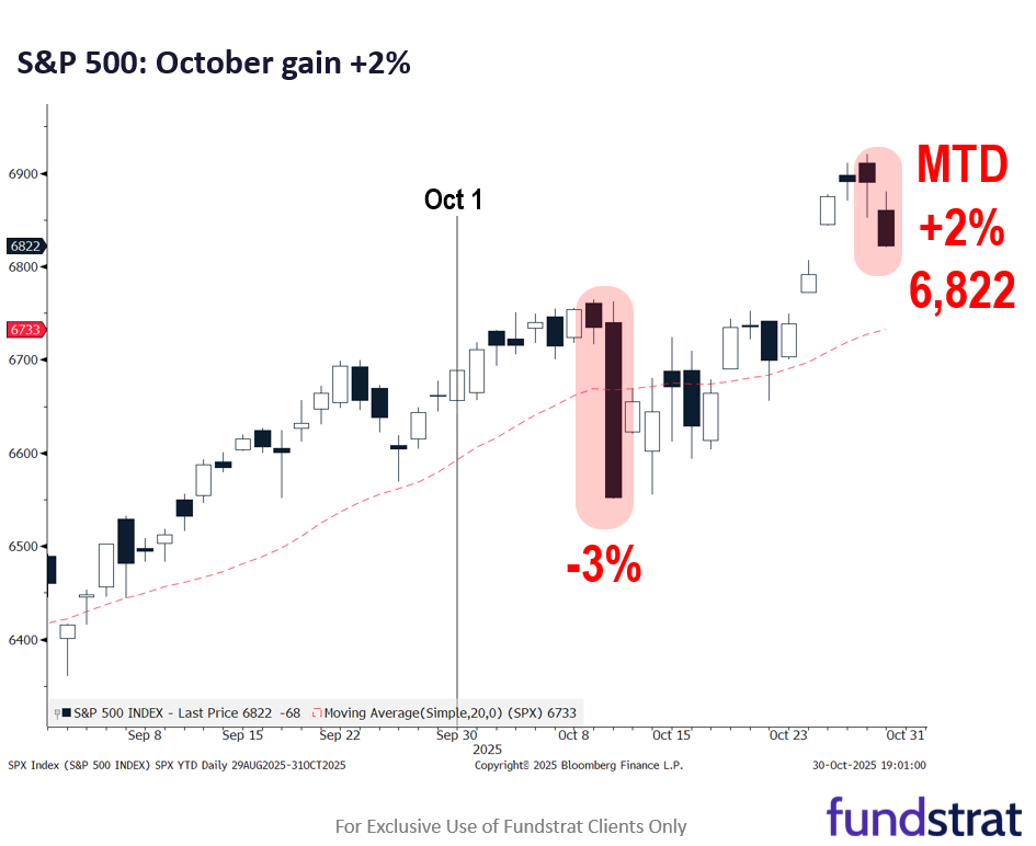 The S&P 500 is on track to close up 2% for October. Looking back at the month, the Oct 10th swoon (-3%) triggered many to become cautious. But as we have highlighted many times this month, we are in the seasonally strong 4th quarter, so we are buying dips.