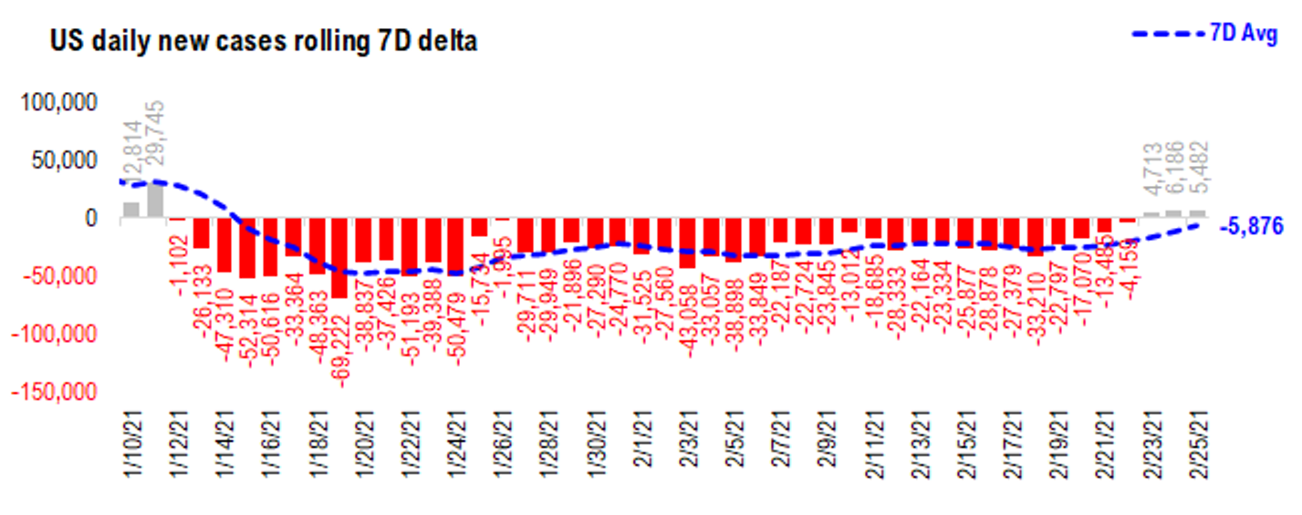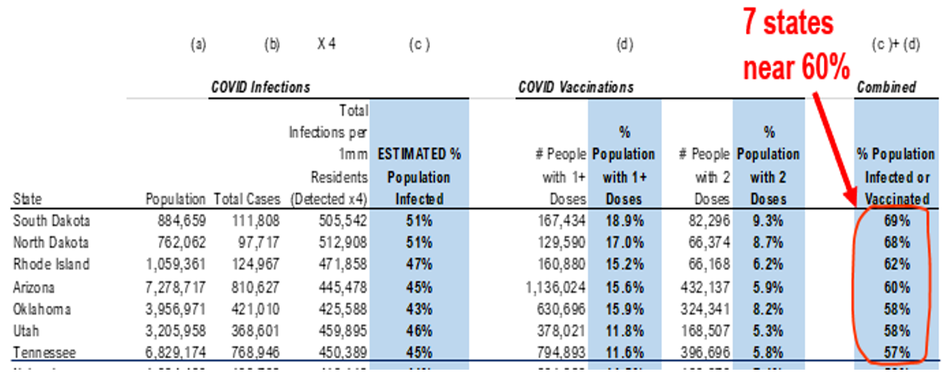 Whatever the reason behind the current uptick, we think it’s too soon to render judgement right now. However, it seems our prediction of sub-25,000 cases in March may be delayed. Despite, this new development we are very positive on the progress of vaccinations. By our calculations, 7 states have now reached the level where combined vaccinations and infections are reaching the critical level of 60% where ‘herd immunity’ may begin kicking in.