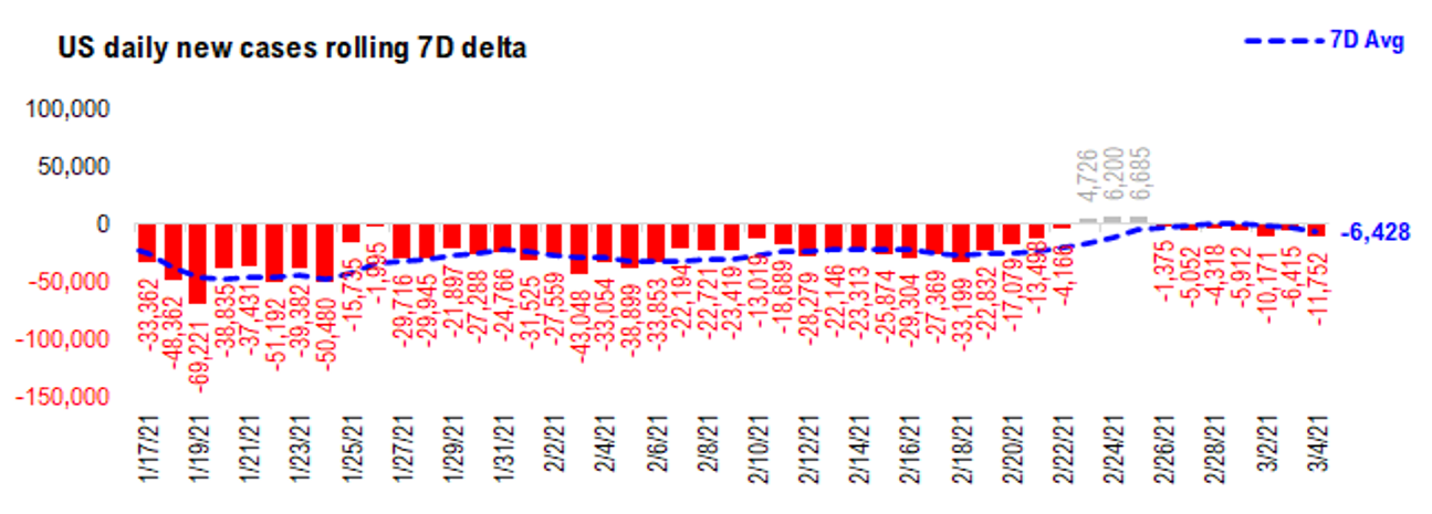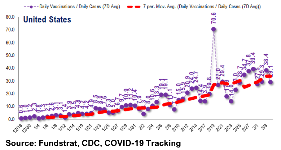 Right now, about 14 million Americans are being vaccinated every week which comes to about 50 million a month. The J&J vaccine has made the supply picture significantly rosier. We could get up to 20 million doses a week, or maybe even 30 million. If we get to this pace, you can expect a lot more states to begin re-opening. We understand the Texas re-opening decision is controversial, but if the vaccination pace continues, we think more and more states will likely follow suit.