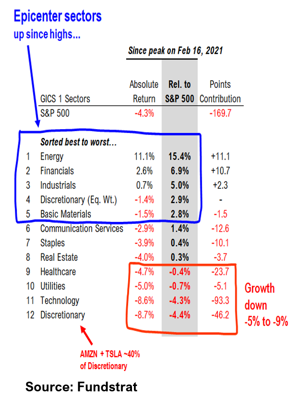 JPM’s Chief Economist Bruce Kasman has recently predicted that US growth will exceed what has recently been seen in China. So, we think the volatility and market turmoil has distracted a lot of investors from the underlying bullish shift in what is rallying on ‘risk-on’ days and what is getting sold on ‘risk-off’ days. For the past 10 years Tech was bought as part of the ‘risk-on’ trade and it worked well. Now, as the market focusses on re-opening, despite the volatility associated with the market high-flyers, cyclicals and ‘Epicenter’ sectors have actually gone up despite what happened to the indexes. Yup.