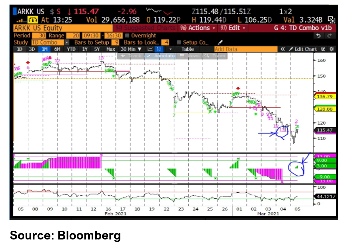 The market action in names like ARK suggest to us that the bottom is in. If your familiar with Tom DeMark’s counter-trading system, you’ll see that the set-up looks positive. We encourage equity investors to have patient hands. We suspect those of you who used the down-days to add to good positions ended up happier than most this week!